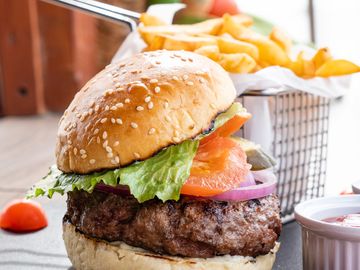 A towering masterpiece of juicy beef, melted cheese, crispy bacon, fresh lettuce, ripe tomatoes, and our signature sauce, all stacked on a soft, toasted bun with Fries Packed with bold flavors and loaded toppings, this burger isn’t just a meal—it’s a statement!